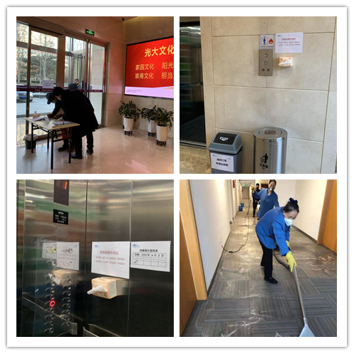 光大科技迅速成立協(xié)調(diào)保障工作小組,做到保障有力,群防群控,制作《光大科技疫情防護(hù)說(shuō)明》,緊急采購(gòu)額溫槍,并采取在電梯間放置廢棄口罩專用垃圾桶、設(shè)置電梯一次性按鍵紙巾、按鍵覆蓋保鮮膜、加強(qiáng)辦公區(qū)域清潔消毒、做好人員體溫測(cè)量及登記等一系列有效措施,保障員工健康。